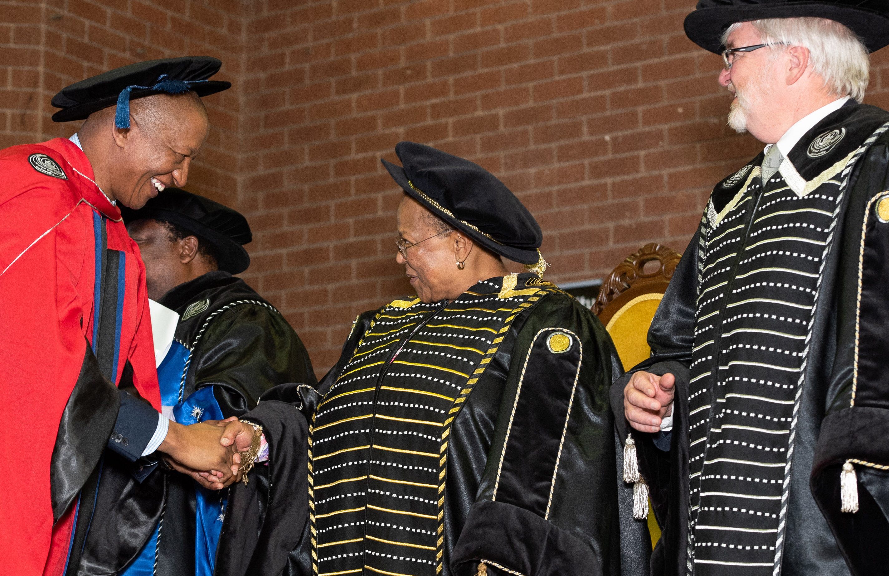 Walter Sisulu University chancellor Dr Sheila Sisulu (centre) conferred an honorary doctorate in commerce on Mthatha-born property developer and Billion Group founder Sisa Ngebulana (left), as vice-chancellor Professor Rob Midgley looks on during a graduation ceremony on May 2. [Image: Supplied]